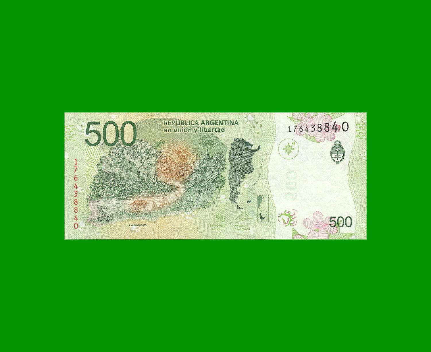 BILLETE PESOS ANIMALES AUTOCTONOS $ 500,00, COL 832e ESTADO SIN CIRCULAR.-