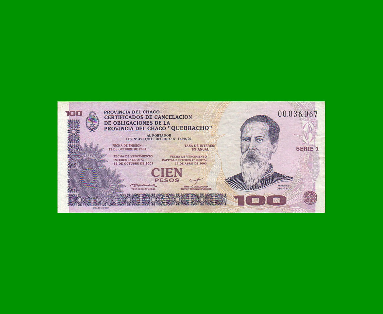 BONO DE CHACO 100 PESOS, EC 257, ESTADO MUY BUENO+ .-
