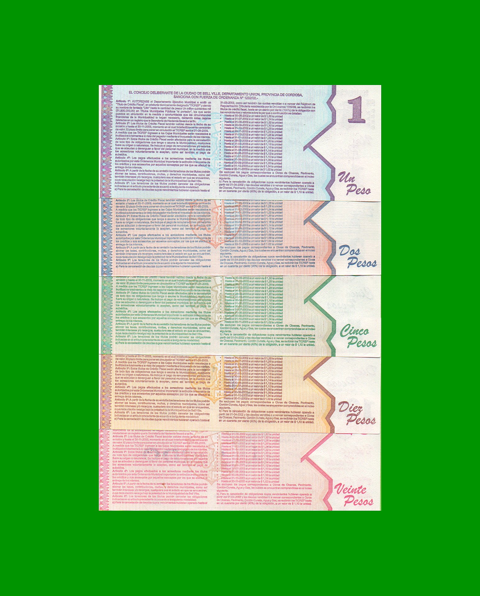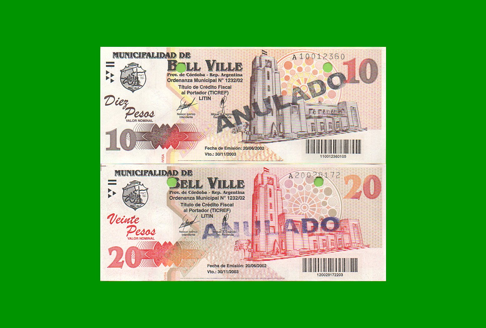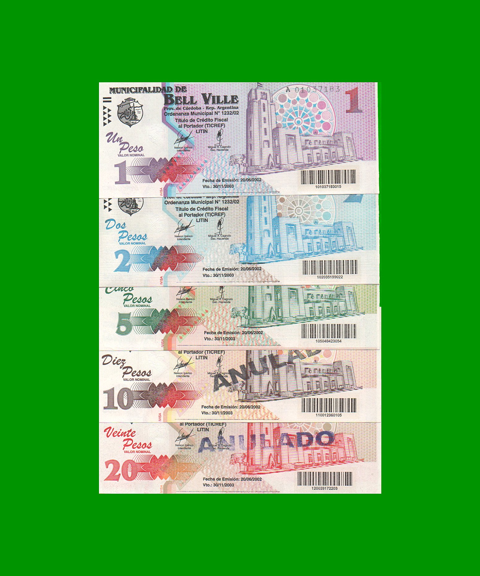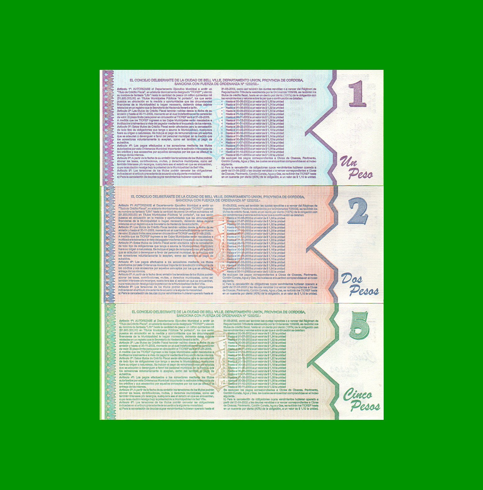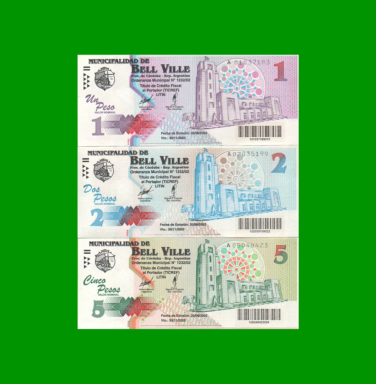 SERIE MUNICIPALIDAD DE BELL VILLE, CORDOBA, DE 5 BONOS, $1,00; $2,00; $5,00